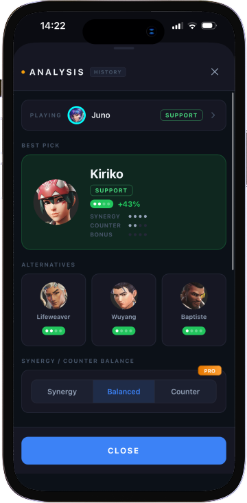 Point your phone at the Overwatch 2 scoreboard. OverHelper instantly identifies every hero and recommends your optimal pick — scored across synergies, counters, map, and rank.